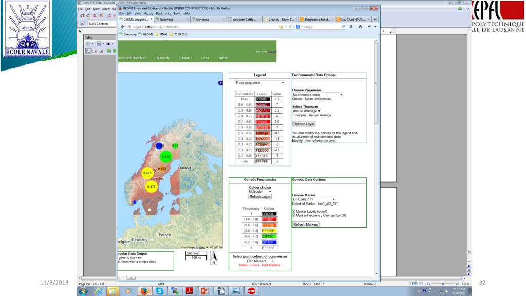 3. Résultats Avantages des l’interfacesintégrées de GENOMAP et de GEOME • L'interface de visualisation de GEOME et de GENOMAP • offre l'exploration des données statistiques et binaires géoréférencées; • offre un fort degré d'interactivité avec les éléments représentés; • Cette interactivité permet notamment : • de sélectionner des individus ou populations; • d'interroger des surfaces de la couche des données environnementales; • d'appeler des informations dérivées; • d'appliquer des analyses statistiques ou spatiales; • Les concepts principaux qui régissent l’interface sont: • Réduire la charge cognitive ; • Mettre le contrôle entre les mains de l'utilisateur. [2] LtzS BÖHM, EV MARÉCHAL