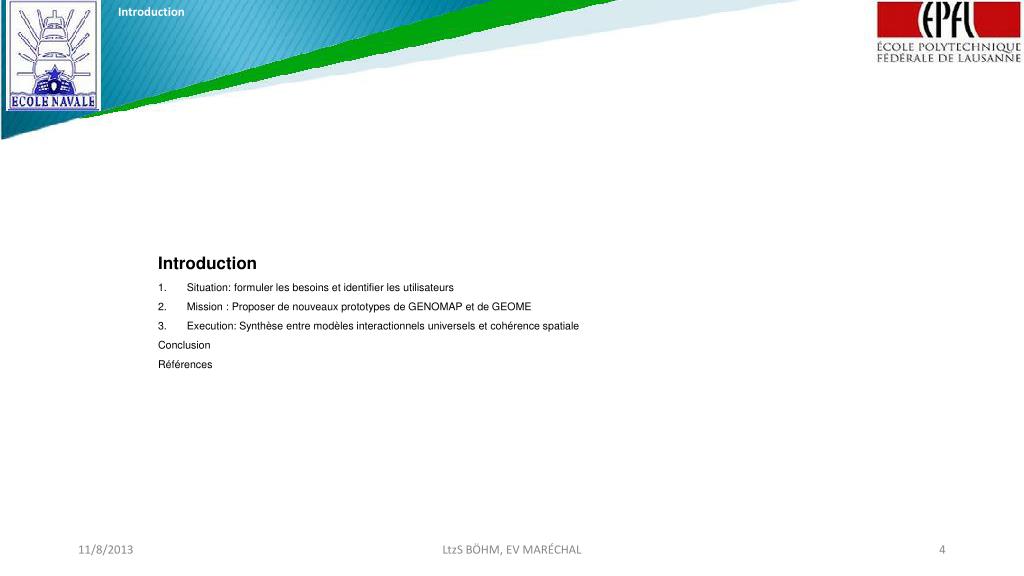 Introduction Introduction • Situation: formulerles besoins et identifier les utilisateurs • Mission : Proposer de nouveaux prototypes de GENOMAP et de GEOME • Execution: Synthèse entre modèlesinteractionnelsuniversels et cohérencespatiale Conclusion Références LtzS BÖHM, EV MARÉCHAL