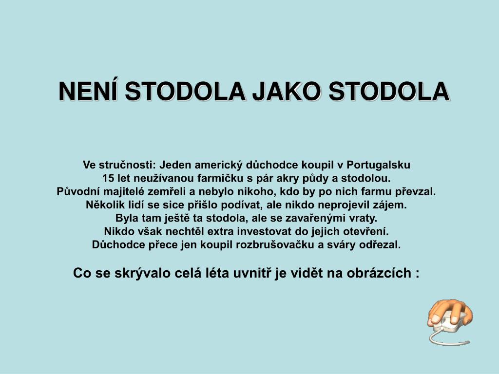 Ve stručnosti: Jeden americký důchodce koupil v Portugalsku15 let neužívanou farmičku s pár akry půdy a stodolou.Původní majitelé zemřeli a nebylo nikoho, kdo by po nich farmu převzal.Několik lidí se sice přišlo podívat, ale nikdo neprojevil zájem. Byla tam ještě ta stodola, ale se zavařenými vraty. Nikdo však nechtěl extra investovat do jejich otevření. Důchodce přece jen koupil rozbrušovačku a sváry odřezal.Co se skrývalo celá léta uvnitř je vidět na obrázcích : NENÍ STODOLA JAKO STODOLA