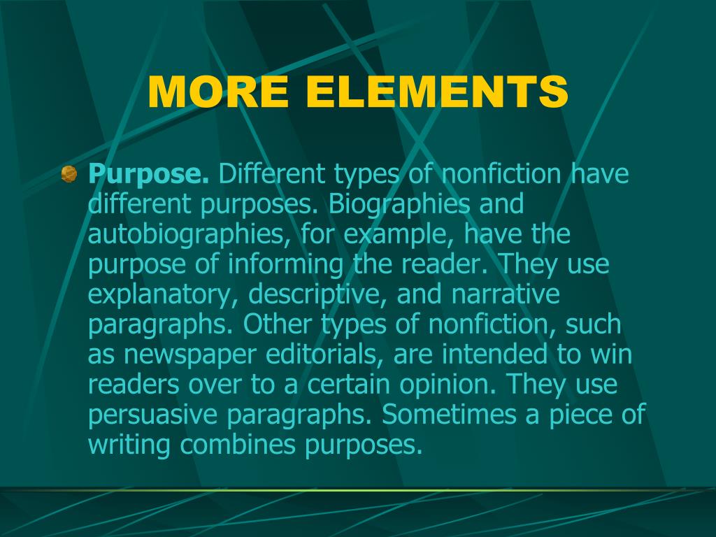 MORE ELEMENTS • Purpose. Different types of nonfiction have different purposes. Biographies and autobiographies, for example, have the purpose of informing the reader. They use explanatory, descriptive, and narrative paragraphs. Other types of nonfiction, such as newspaper editorials, are intended to win readers over to a certain opinion. They use persuasive paragraphs. Sometimes a piece of writing combines purposes.