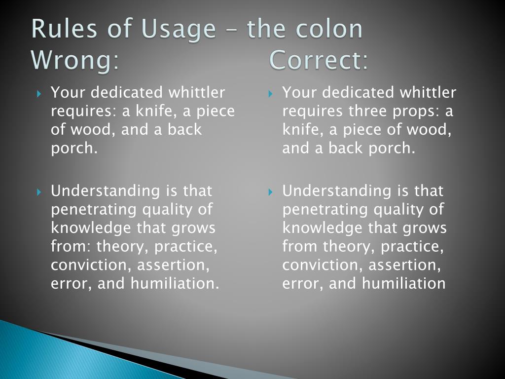 Rules of Usage – the colonWrong: Correct: • Your dedicated whittler requires three props: a knife, a piece of wood, and a back porch. • Understanding is that penetrating quality of knowledge that grows from theory, practice, conviction, assertion, error, and humiliation • Your dedicated whittler requires: a knife, a piece of wood, and a back porch. • Understanding is that penetrating quality of knowledge that grows from: theory, practice, conviction, assertion, error, and humiliation.