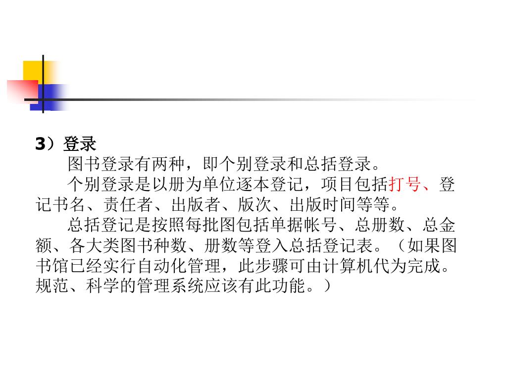 3)登录 图书登录有两种,即个别登录和总括登录。 个别登录是以册为单位逐本登记,项目包括打号、登记书名、责任者、出版者、版次、出版时间等等。 总括登记是按照每批图包括单据帐号、总册数、总金额、各大类图书种数、册数等登入总括登记表。(如果图书馆已经实行自动化管理,此步骤可由计算机代为完成。规范、科学的管理系统应该有此功能。)