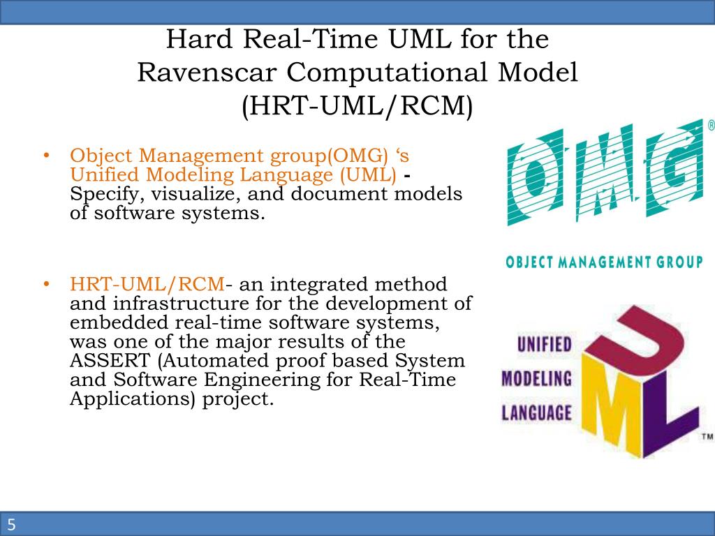 Hard Real-Time UML for theRavenscar Computational Model(HRT-UML/RCM) • Object Management group(OMG) ‘s Unified Modeling Language (UML)- Specify, visualize, and document models of software systems. • HRT-UML/RCM-an integrated method and infrastructure for the development of embedded real-time software systems, was one of the major results of the ASSERT (Automated proof based System and Software Engineering for Real-Time Applications) project. 5