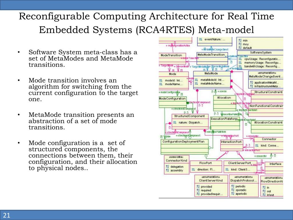 Reconfigurable Computing Architecture for Real Time Embedded Systems (RCA4RTES) Meta-model • Software System meta-class has a set of MetaModes and MetaMode transitions. • Mode transition involves an algorithm for switching from the current configuration to the target one. • MetaMode transition presents an abstraction of a set of mode transitions. • Mode configuration is a set of structured components, the connections between them, their configuration, and their allocation to physical nodes.. 21