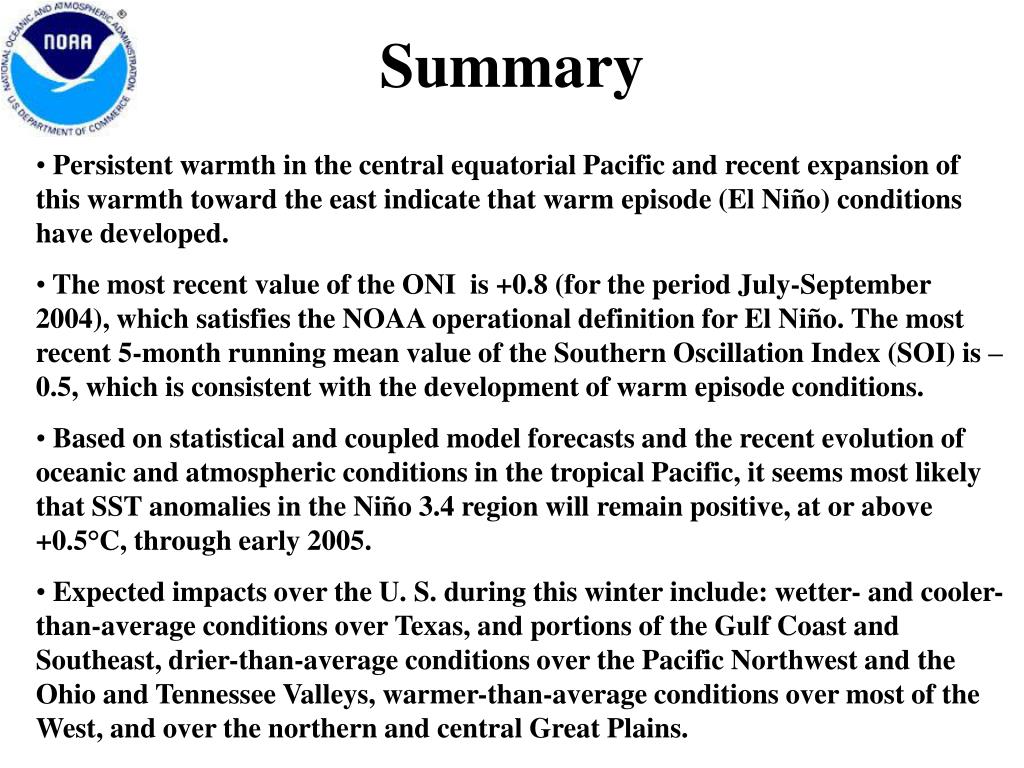 Summary • Persistent warmth in the central equatorial Pacific and recent expansion of this warmth toward the east indicate that warm episode (El Niño) conditions have developed. • The most recent value of the ONI is +0.8 (for the period July-September 2004), which satisfies the NOAA operational definition for El Niño. The most recent 5-month running mean value of the Southern Oscillation Index (SOI) is –0.5, which is consistent with the development of warm episode conditions. • Based on statistical and coupled model forecasts and the recent evolution of oceanic and atmospheric conditions in the tropical Pacific, it seems most likely that SST anomalies in the Niño 3.4 region will remain positive, at or above +0.5°C, through early 2005. • Expected impacts over the U. S. during this winter include: wetter- and cooler-than-average conditions over Texas, and portions of the Gulf Coast and Southeast, drier-than-average conditions over the Pacific Northwest and the Ohio and Tennessee Valleys, warmer-than-average conditions over most of the West, and over the northern and central Great Plains.