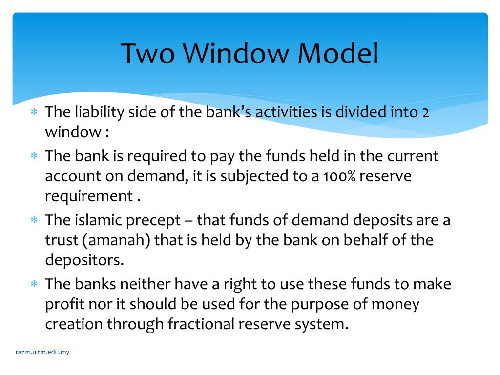 Two Window Model razizi.uitm.edu.my The liability side of the bank’s activities is divided into 2 window : The bank is required to pay the funds held in the current account on demand, it is subjected to a 100% reserve requirement . The islamic precept – that funds of demand deposits are a trust (amanah) that is held by the bank on behalf of the depositors. The banks neither have a right to use these funds to make profit nor it should be used for the purpose of money creation through fractional reserve system.