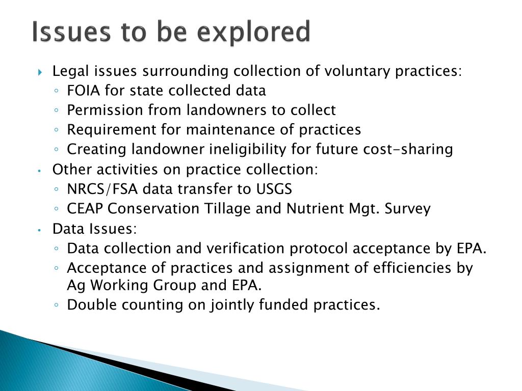 Issues to be explored • Legal issues surrounding collection of voluntary practices: • FOIA for state collected data • Permission from landowners to collect • Requirement for maintenance of practices • Creating landowner ineligibility for future cost-sharing • Other activities on practice collection: • NRCS/FSA data transfer to USGS • CEAP Conservation Tillage and Nutrient Mgt. Survey • Data Issues: • Data collection and verification protocol acceptance by EPA. • Acceptance of practices and assignment of efficiencies by Ag Working Group and EPA. • Double counting on jointly funded practices.