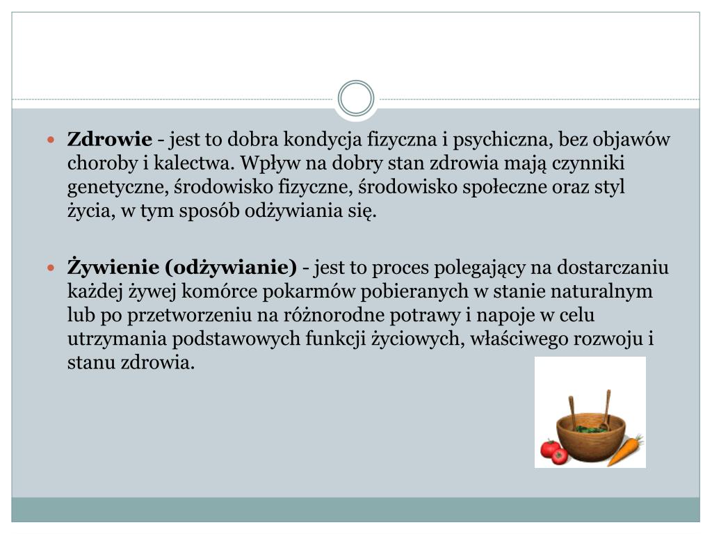 Zdrowie - jest to dobra kondycja fizyczna i psychiczna, bez objawów choroby i kalectwa. Wpływ na dobry stan zdrowia mają czynniki genetyczne, środowisko fizyczne, środowisko społeczne oraz styl życia, w tym sposób odżywiania się. Żywienie (odżywianie) - jest to proces polegający na dostarczaniu każdej żywej komórce pokarmów pobieranych w stanie naturalnym lub po przetworzeniu na różnorodne potrawy i napoje w celu utrzymania podstawowych funkcji życiowych, właściwego rozwoju i stanu zdrowia.