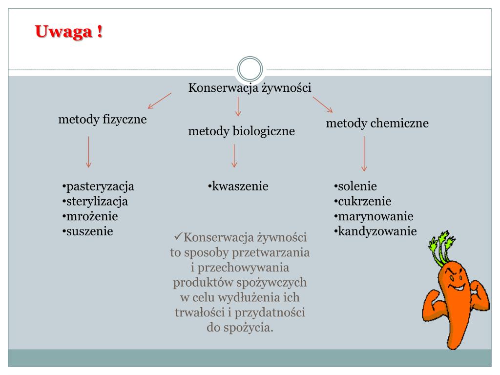 Uwaga ! Konserwacja żywności metody fizyczne metody chemiczne metody biologiczne • pasteryzacja • sterylizacja • mrożenie • suszenie • kwaszenie • solenie • cukrzenie • marynowanie • kandyzowanie • Konserwacja żywności to sposoby przetwarzania i przechowywania produktów spożywczych w celu wydłużenia ich trwałości i przydatności do spożycia.