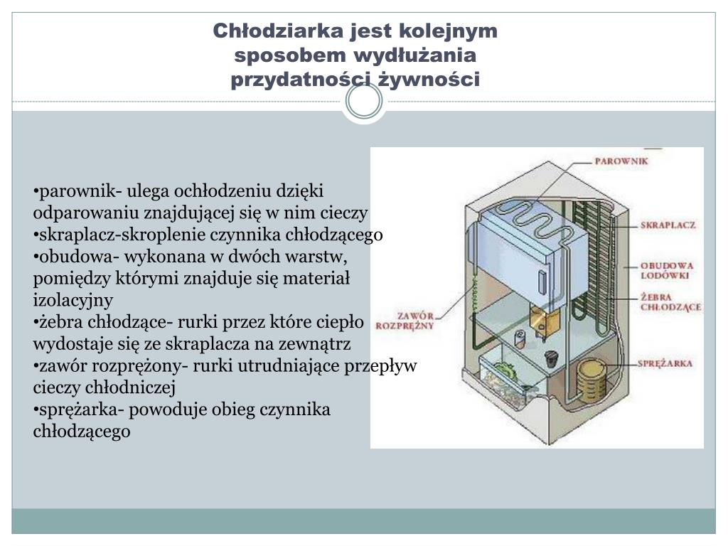 Chłodziarka jest kolejnym sposobem wydłużania przydatności żywności • parownik- ulega ochłodzeniu dzięki odparowaniu znajdującej się w nim cieczy • skraplacz-skroplenie czynnika chłodzącego • obudowa- wykonana w dwóch warstw, pomiędzy którymi znajduje się materiał izolacyjny • żebra chłodzące- rurki przez które ciepło wydostaje się ze skraplacza na zewnątrz • zawór rozprężony- rurki utrudniające przepływ cieczy chłodniczej • sprężarka- powoduje obieg czynnika chłodzącego