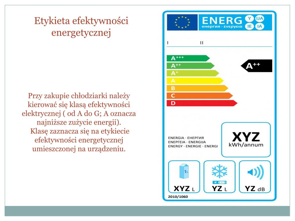 Etykieta efektywności energetycznej Przy zakupie chłodziarki należy kierować się klasą efektywności elektrycznej ( od A do G; A oznacza najniższe zużycie energii). Klasę zaznacza się na etykiecie efektywności energetycznej umieszczonej na urządzeniu.