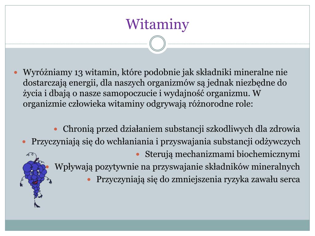 Witaminy Wyróżniamy 13 witamin, które podobnie jak składniki mineralne nie dostarczają energii, dla naszych organizmów są jednak niezbędne do życia i dbają o nasze samopoczucie i wydajność organizmu. W organizmie człowieka witaminy odgrywają różnorodne role: Chronią przed działaniem substancji szkodliwych dla zdrowia Przyczyniają się do wchłaniania i przyswajania substancji odżywczych Sterują mechanizmami biochemicznymi Wpływają pozytywnie na przyswajanie składników mineralnych Przyczyniają się do zmniejszenia ryzyka zawału serca