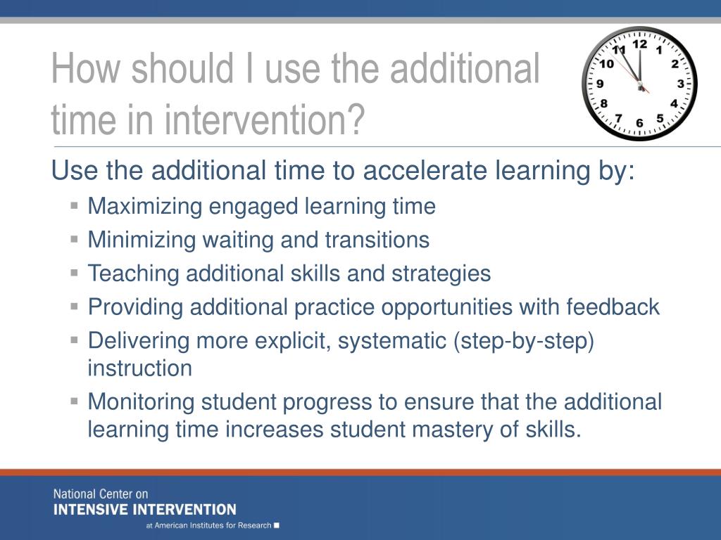 How should I use the additional time in intervention? Use the additional time to accelerate learning by: Maximizing engaged learning time Minimizing waiting and transitions Teaching additional skills and strategies Providing additional practice opportunities with feedback Delivering more explicit, systematic (step-by-step) instruction Monitoring student progress to ensure that the additional learning time increases student mastery of skills.
