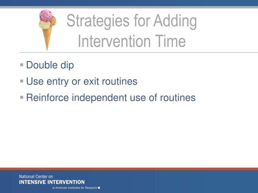 Strategies for Adding Intervention Time • Double dip • Use entry or exit routines • Reinforce independent use of routines