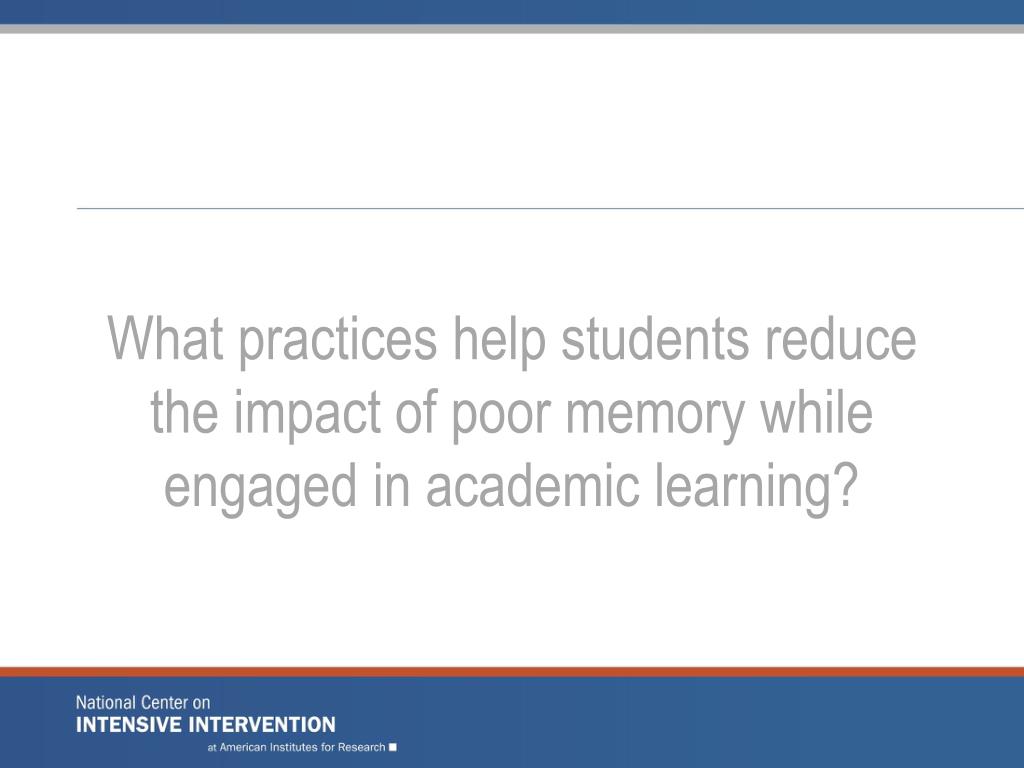 How does poor memory impede academic success? Students with memory problems may have difficulty recalling: A sentence or description they just read Components of a multi-step math problem Steps in a sequence (e.g., math operations, independent work, organizational routines) Multi-step directions Previous learning that relates to new information Information presented in one modality (e.g., auditory only) (Swanson, Zheng, & Jerman, 2009).