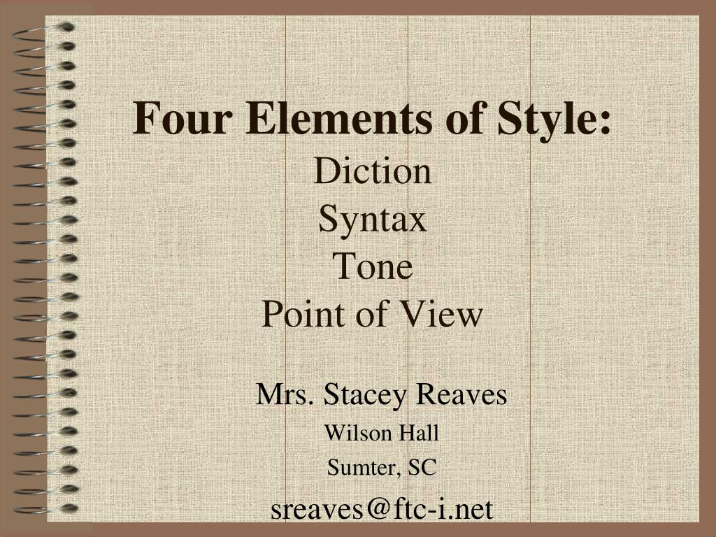 Four Elements of Style:DictionSyntaxTonePoint of View Mrs. Stacey Reaves Wilson Hall Sumter, SC sreaves@ftc-i.net