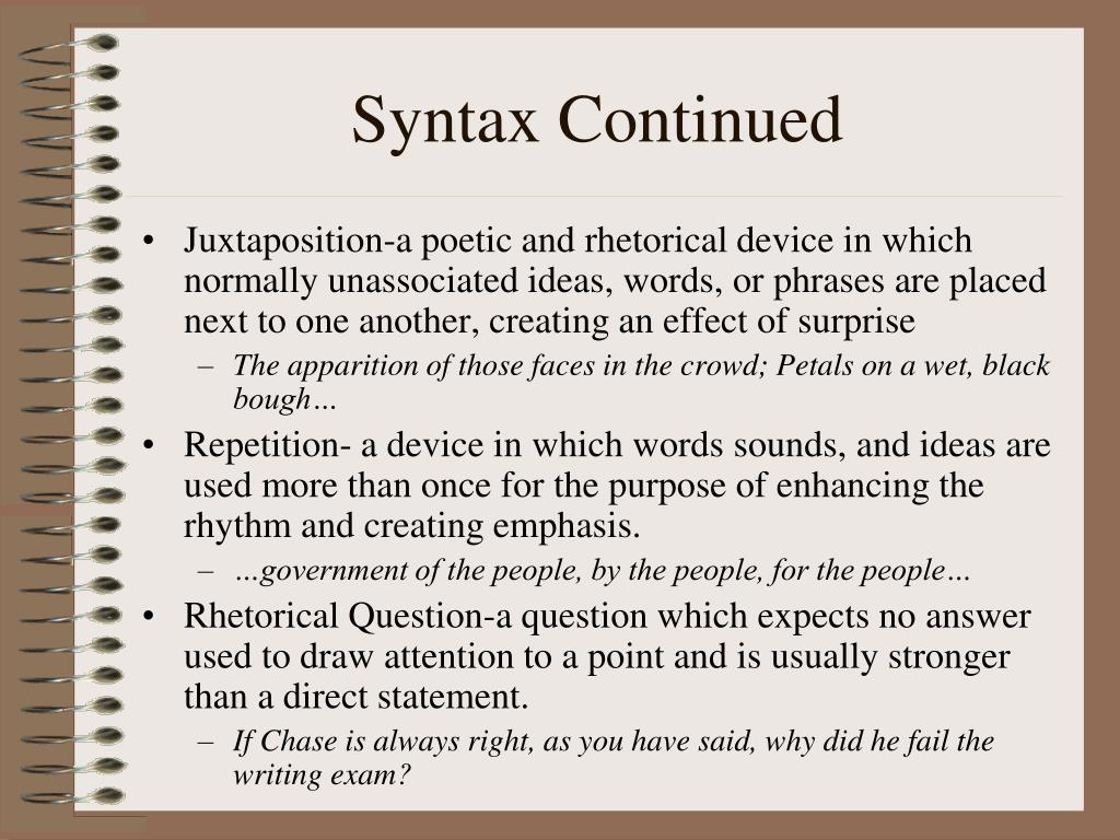 Syntax Continued • Juxtaposition-a poetic and rhetorical device in which normally unassociated ideas, words, or phrases are placed next to one another, creating an effect of surprise • The apparition of those faces in the crowd; Petals on a wet, black bough… • Repetition- a device in which words sounds, and ideas are used more than once for the purpose of enhancing the rhythm and creating emphasis. • …government of the people, by the people, for the people… • Rhetorical Question-a question which expects no answer used to draw attention to a point and is usually stronger than a direct statement. • If Chase is always right, as you have said, why did he fail the writing exam?