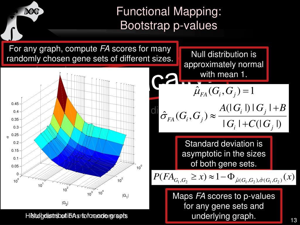 Functional Mapping:Bootstrap p-values For any graph, compute FA scores for many randomly chosen gene sets of different sizes. • Scoring functional associations is great… …how do you interpret an association score? • For gene sets of arbitrary sizes? • In arbitrary graphs? • Each with its own bizarre distribution of edges? Null distribution is approximately normal with mean 1. Empirically! Standard deviation is asymptotic in the sizes of both gene sets. Maps FA scores to p-values for any gene sets and underlying graph. Histograms of FAs for random sets Null distribution σs for one graph