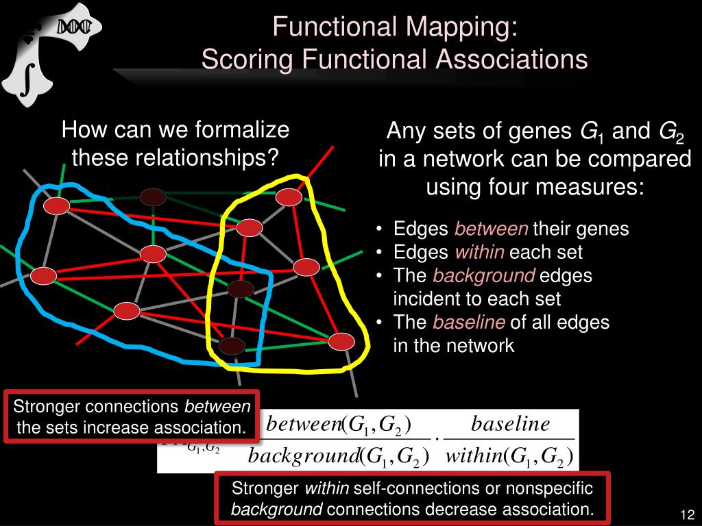 Functional Mapping:Scoring Functional Associations How can we formalizethese relationships? • Any sets of genes G1 and G2 in a network can be compared using four measures: • Edges between their genes • Edges within each set • The background edges incident to each set • The baseline of all edges in the network Stronger connections between the sets increase association. Stronger within self-connections or nonspecific background connections decrease association.