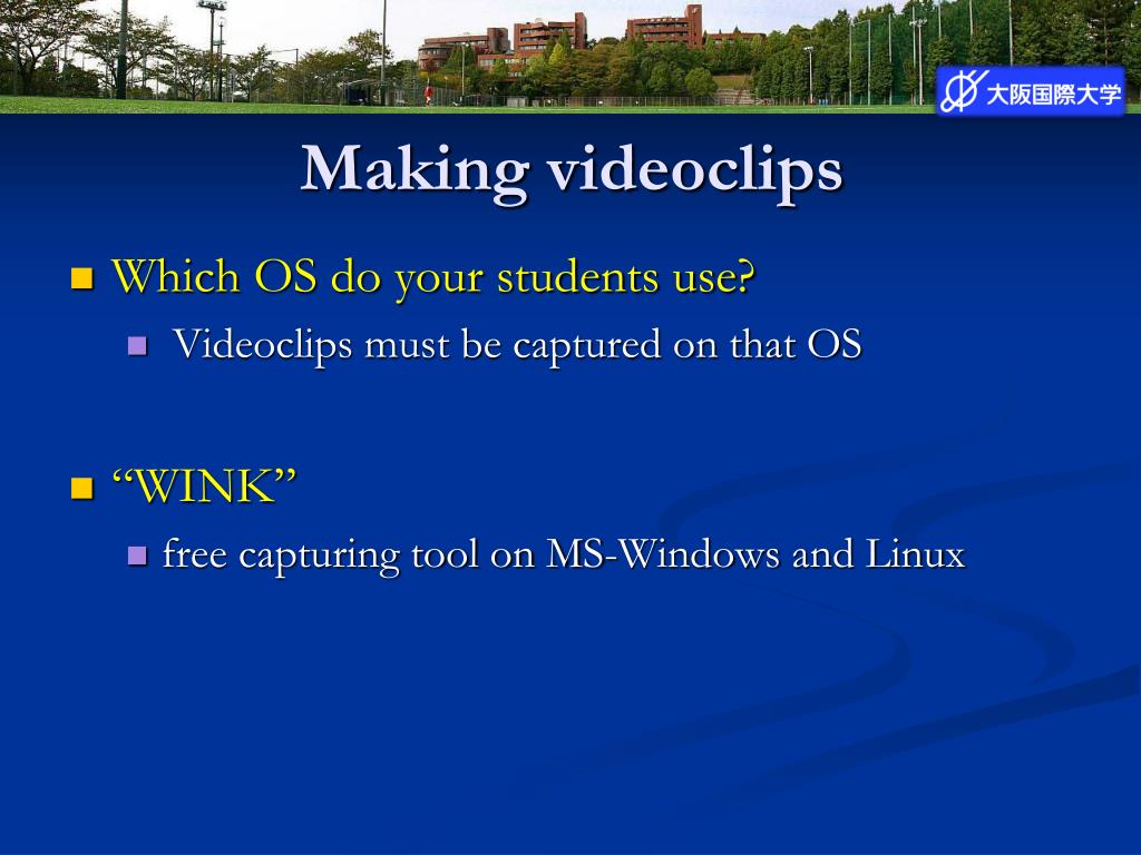 Making videoclips • Which OS do your students use? • Videoclips must be captured on that OS • “WINK” • free capturing tool on MS-Windows and Linux