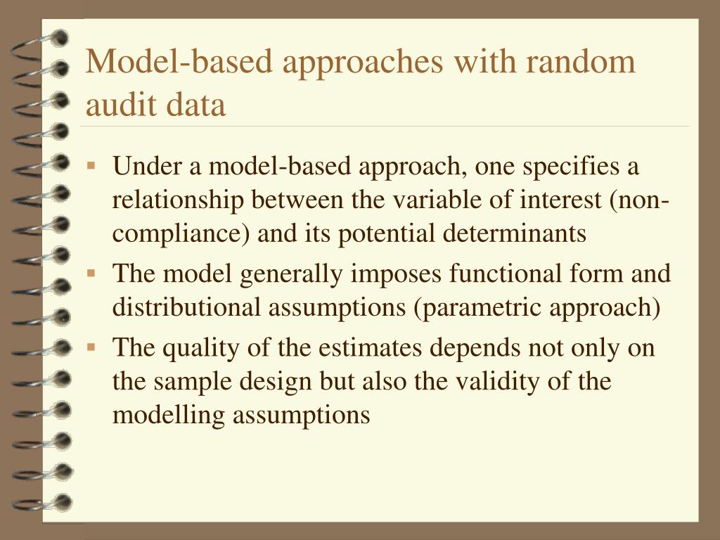 Model-based approaches with random audit data • Under a model-based approach, one specifies a relationship between the variable of interest (non-compliance) and its potential determinants • The model generally imposes functional form and distributional assumptions (parametric approach) • The quality of the estimates depends not only on the sample design but also the validity of the modelling assumptions