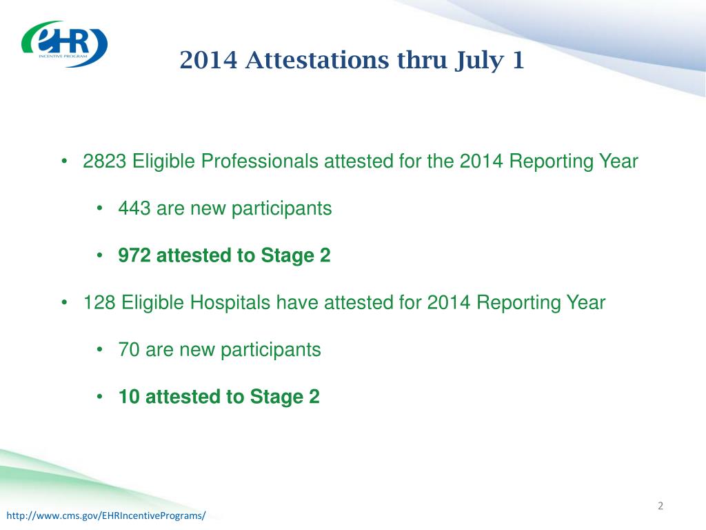 2014 Attestations thru July 1 • 2823 Eligible Professionals attested for the 2014 Reporting Year • 443 are new participants • 972 attested to Stage 2 • 128 Eligible Hospitals have attested for 2014 Reporting Year • 70 are new participants • 10 attested to Stage 2