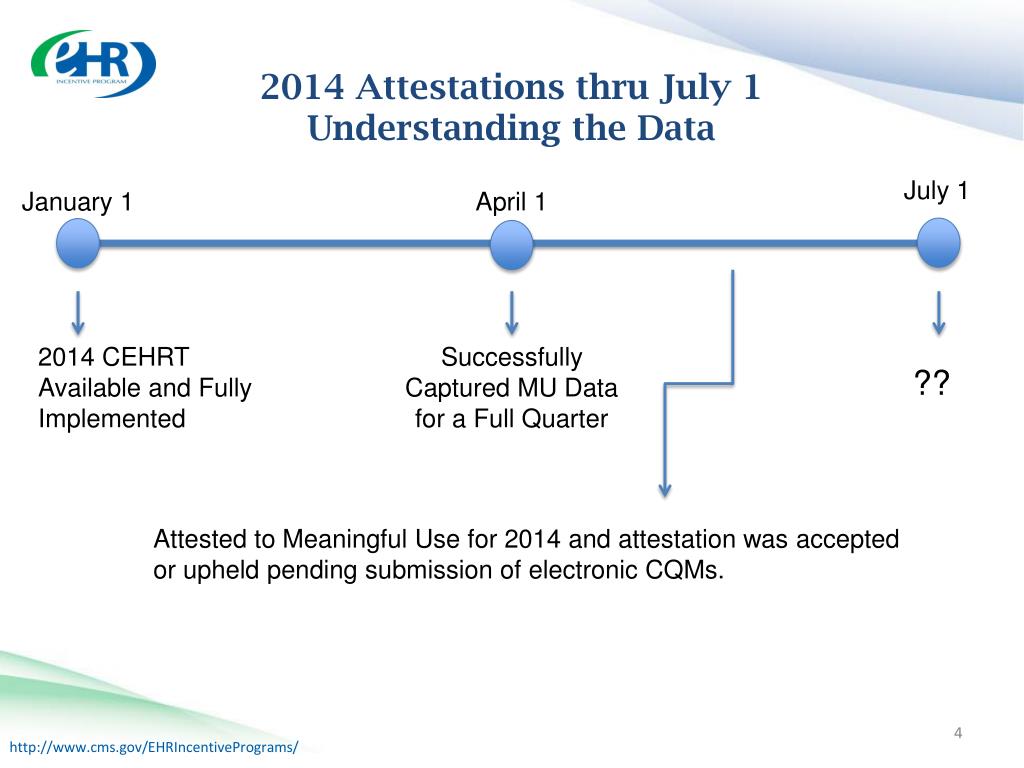 2014 Attestations thru July 1 Understanding the Data July 1 January 1 April 1 2014 CEHRT Available and Fully Implemented Successfully Captured MU Data for a Full Quarter ?? Attested to Meaningful Use for 2014 and attestation was accepted or upheld pending submission of electronic CQMs.