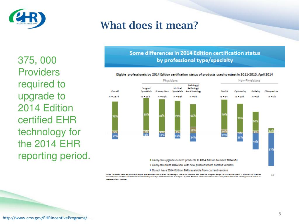What does it mean? 375, 000 Providersrequired to upgrade to 2014 Edition certified EHR technology for the 2014 EHR reporting period.