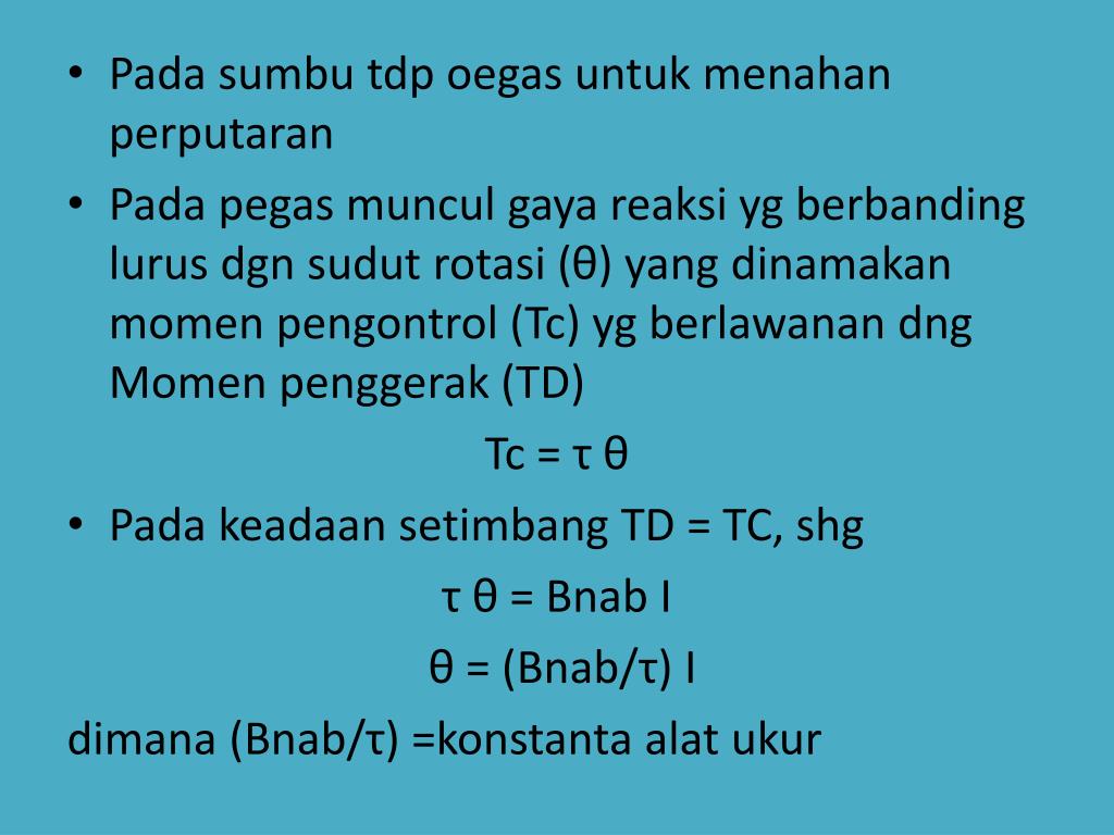 Pada sumbu tdp oegas untuk menahan perputaran • Pada pegas muncul gaya reaksi yg berbanding lurus dgn sudut rotasi (θ) yang dinamakan momen pengontrol (Tc) yg berlawanan dng Momen penggerak (TD) Tc = τθ • Pada keadaan setimbang TD = TC, shg τθ = Bnab I θ = (Bnab/τ) I dimana (Bnab/τ) =konstanta alat ukur