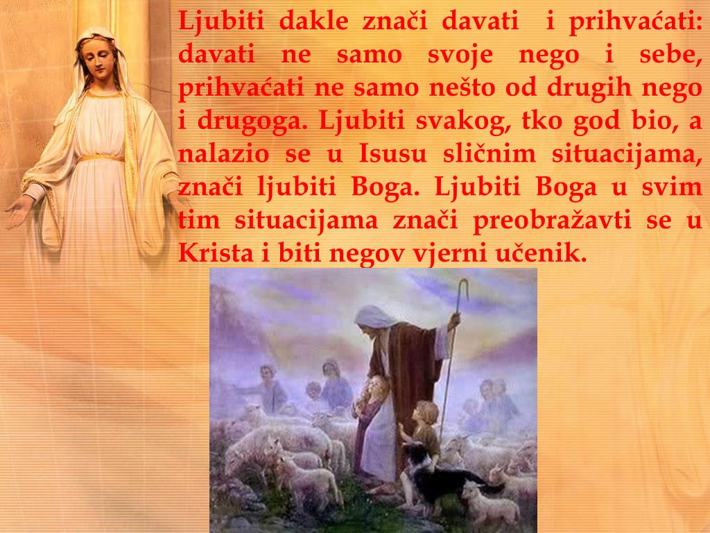 Ljubiti dakle znači davati i prihvaćati: davati ne samo svoje nego i sebe, prihvaćati ne samo nešto od drugih nego i drugoga. Ljubiti svakog, tko god bio, a nalazio se u Isusu sličnim situacijama, znači ljubiti Boga. Ljubiti Boga u svim tim situacijama znači preobražavti se u Krista i biti negov vjerni učenik.