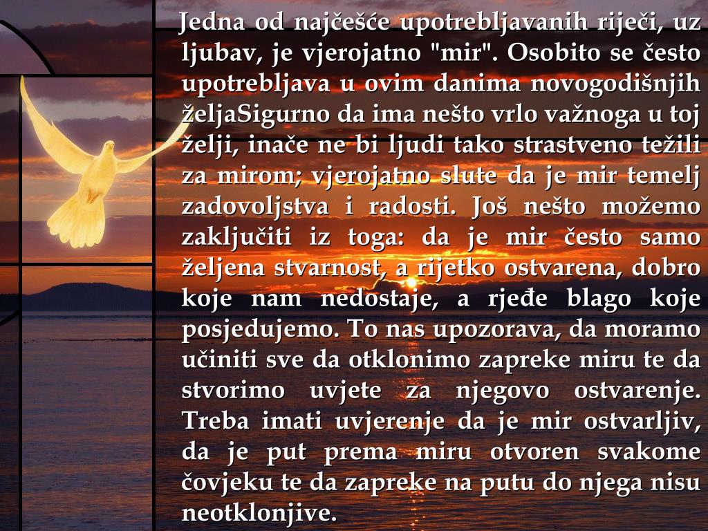 Jedna od najčešće upotrebljavanih riječi, uz ljubav, je vjerojatno "mir". Osobito se često upotrebljava u ovim danima novogodišnjih željaSigurno da ima nešto vrlo važnoga u toj želji, inače ne bi ljudi tako strastveno težili za mirom; vjerojatno slute da je mir temelj zadovoljstva i radosti. Još nešto možemo zaključiti iz toga: da je mir često samo željena stvarnost, a rijetko ostvarena, dobro koje nam nedostaje, a rjeđe blago koje posjedujemo. To nas upozorava, da moramo učiniti sve da otklonimo zapreke miru te da stvorimo uvjete za njegovo ostvarenje. Treba imati uvjerenje da je mir ostvarljiv, da je put prema miru otvoren svakome čovjeku te da zapreke na putu do njega nisu neotklonjive.