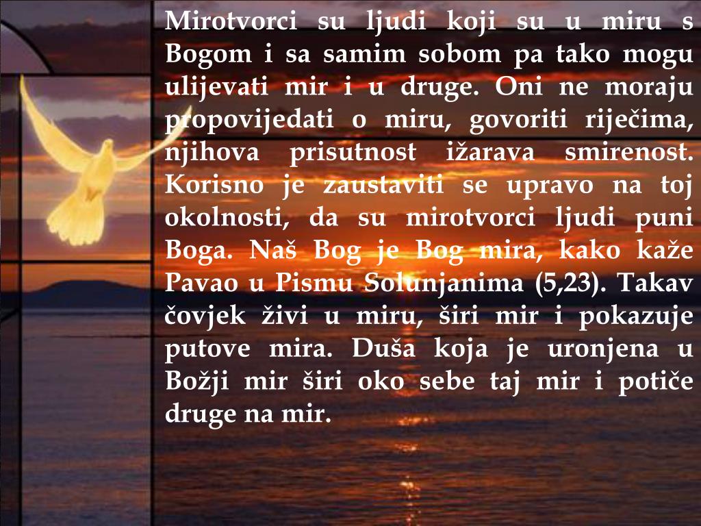 Mirotvorci su ljudi koji su u miru s Bogom i sa samim sobom pa tako mogu ulijevati mir i u druge. Oni ne moraju propovijedati o miru, govoriti riječima, njihova prisutnost ižarava smirenost. Korisno je zaustaviti se upravo na toj okolnosti, da su mirotvorci ljudi puni Boga. Naš Bog je Bog mira, kako kaže Pavao u Pismu Solunjanima (5,23). Takav čovjek živi u miru, širi mir i pokazuje putove mira. Duša koja je uronjena u Božji mir širi oko sebe taj mir i potiče druge na mir.