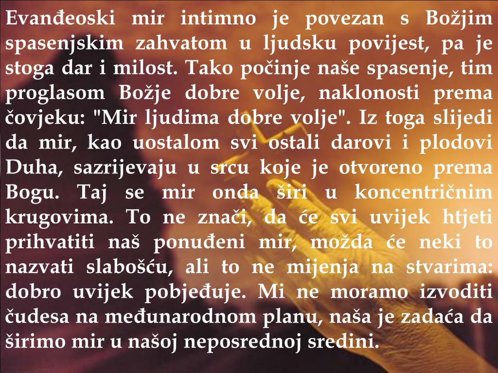 Evanđeoski mir intimno je povezan s Božjim spasenjskim zahvatom u ljudsku povijest, pa je stoga dar i milost. Tako počinje naše spasenje, tim proglasom Božje dobre volje, naklonosti prema čovjeku: "Mir ljudima dobre volje". Iz toga slijedi da mir, kao uostalom svi ostali darovi i plodovi Duha, sazrijevaju u srcu koje je otvoreno prema Bogu. Taj se mir onda širi u koncentričnim krugovima. To ne znači, da će svi uvijek htjeti prihvatiti naš ponuđeni mir, možda će neki to nazvati slabošću, ali to ne mijenja na stvarima: dobro uvijek pobjeđuje. Mi ne moramo izvoditi čudesa na međunarodnom planu, naša je zadaća da širimo mir u našoj neposrednoj sredini. Jedna od najčešće upotrebljavanih riječi, uz ljubav, je vjerojatno "mir". Osobito se često upotrebljava u ovim danima novogodišnjih željaSigurno da ima nešto vrlo važnoga u toj želji, inače ne bi ljudi tako strastveno težili za mirom; vjerojatno slute da je mir temelj zadovoljstva i radosti. Još nešto možemo zaključiti iz toga: da je mir često samo željena stvarnost, a rijetko ostvarena, dobro koje nam nedostaje, a rjeđe blago koje posjedujemo. To nas upozorava, da moramo učiniti sve da otklonimo zapreke miru te da stvorimo uvjete za njegovo ostvarenje. Treba imati uvjerenje da je mir ostvarljiv, da je put prema miru otvoren svakome čovjeku te da zapreke na putu do njega nisu neotklonjive.