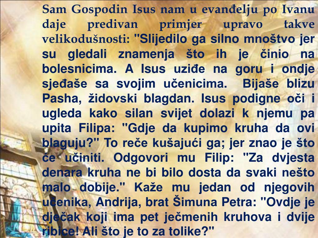 Sam Gospodin Isus nam u evanđelju po Ivanu daje predivan primjer upravo takve velikodušnosti: "Slijedilo ga silno mnoštvo jer su gledali znamenja što ih je činio na bolesnicima. A Isus uziđe na goru i ondje sjeđaše sa svojim učenicima. Bijaše blizu Pasha, židovski blagdan. Isus podigne oči i ugleda kako silan svijet dolazi k njemu pa upita Filipa: "Gdje da kupimo kruha da ovi blaguju?" To reče kušajući ga; jer znao je što će učiniti. Odgovori mu Filip: "Za dvjesta denara kruha ne bi bilo dosta da svaki nešto malo dobije." Kaže mu jedan od njegovih učenika, Andrija, brat Šimuna Petra: "Ovdje je dječak koji ima pet ječmenih kruhova i dvije ribice! Ali što je to za tolike?"