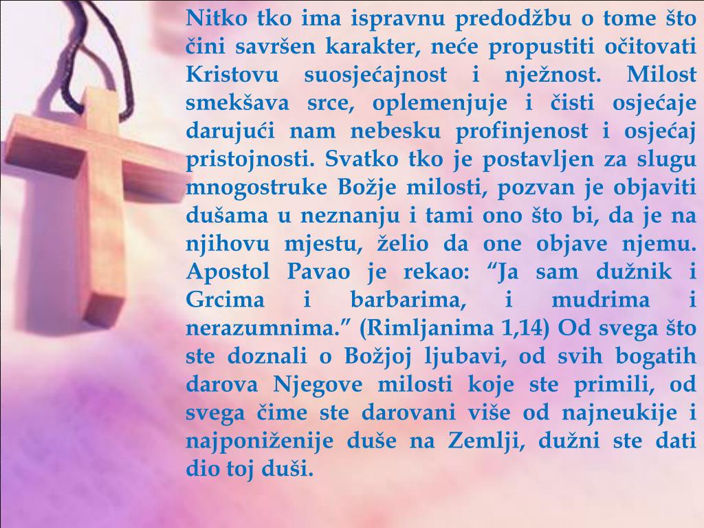 Nitko tko ima ispravnu predodžbu o tome što čini savršen karakter, neće propustiti očitovati Kristovu suosjećajnost i nježnost. Milost smekšava srce, oplemenjuje i čisti osjećaje darujući nam nebesku profinjenost i osjećaj pristojnosti.Svatkotko je postavljenzaslugumnogostrukeBožjemilosti, pozvan je objavitidušama u neznanjuitamionošto bi, da je nanjihovumjestu, želio da one objavenjemu. ApostolPavao je rekao: “JasamdužnikiGrcimaibarbarima, imudrimainerazumnima.” (Rimljanima 1,14) Od svegaštostedoznali o Božjojljubavi, od svihbogatihdarovaNjegovemilostikojesteprimili, od svegačimestedarovaniviše od najneukijeinajponiženijedušenaZemlji, dužnistedatidiotojduši.