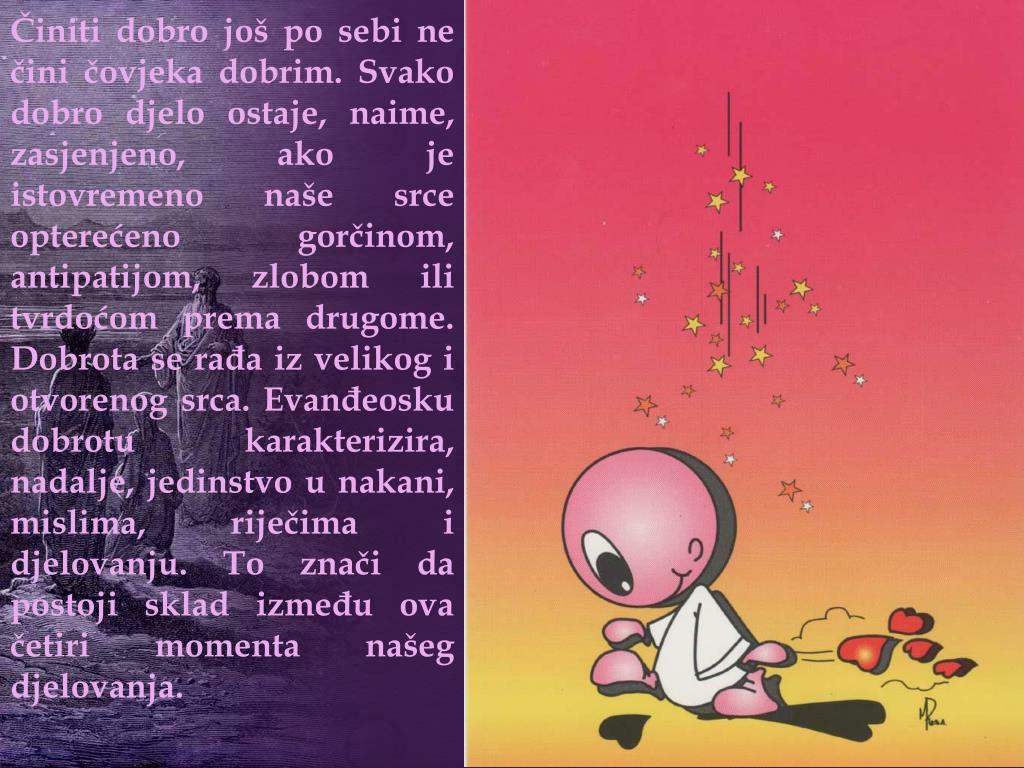 Činiti dobro još po sebi ne čini čovjeka dobrim. Svako dobro djelo ostaje, naime, zasjenjeno, ako je istovremeno naše srce opterećeno gorčinom, antipatijom, zlobom ili tvrdoćom prema drugome. Dobrota se rađa iz velikog i otvorenog srca. Evanđeosku dobrotu karakterizira, nadalje, jedinstvo u nakani, mislima, riječima i djelovanju. To znači da postoji sklad između ova četiri momenta našeg djelovanja.