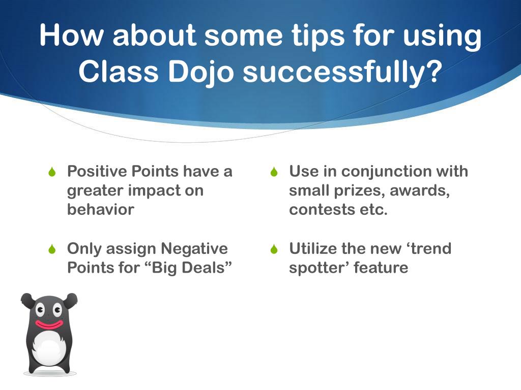 How about some tips for using Class Dojo successfully? • Use in conjunction with small prizes, awards, contests etc. • Utilize the new ‘trend spotter’ feature • Positive Points have a greater impact on behavior • Only assign Negative Points for “Big Deals”