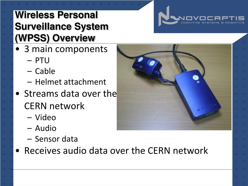 Wireless Personal Surveillance System (WPSS) Overview • 3 main components • PTU • Cable • Helmet attachment • Streams data over the CERN network • Video • Audio • Sensor data • Receives audio data over the CERN network