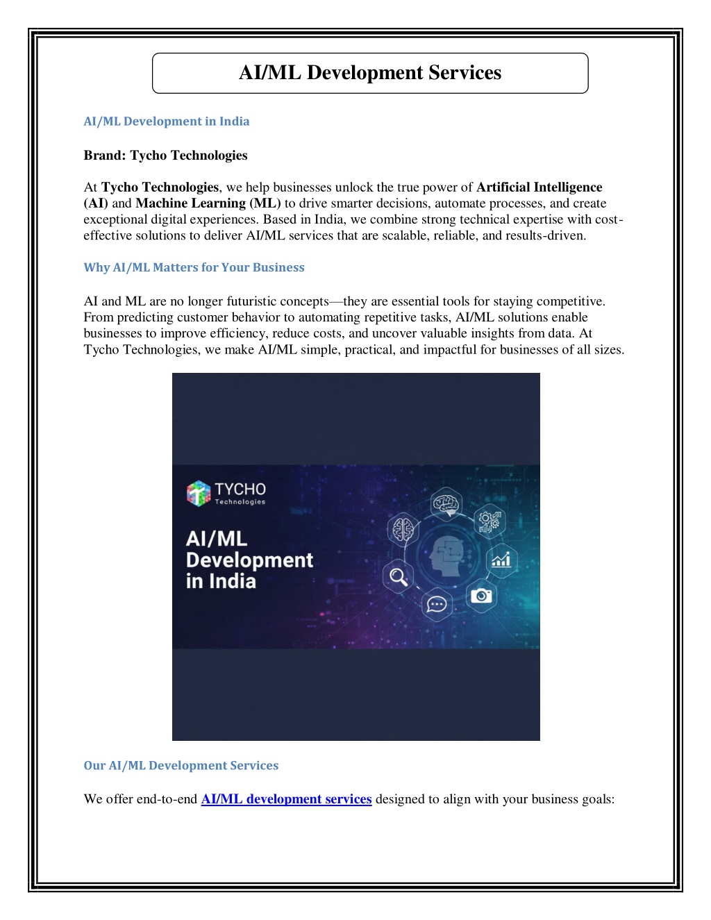 AI/ML Development Services AI/ML Development in India Brand: Tycho Technologies At Tycho Technologies, we help businesses unlock the true power of Artificial Intelligence (AI) and Machine Learning (ML) to drive smarter decisions, automate processes, and create exceptional digital experiences. Based in India, we combine strong technical expertise with cost- effective solutions to deliver AI/ML services that are scalable, reliable, and results-driven. Why AI/ML Matters for Your Business AI and ML are no longer futuristic concepts—they are essential tools for staying competitive. From predicting customer behavior to automating repetitive tasks, AI/ML solutions enable businesses to improve efficiency, reduce costs, and uncover valuable insights from data. At Tycho Technologies, we make AI/ML simple, practical, and impactful for businesses of all sizes. Our AI/ML Development Services We offer end-to-end AI/ML development services designed to align with your business goals: