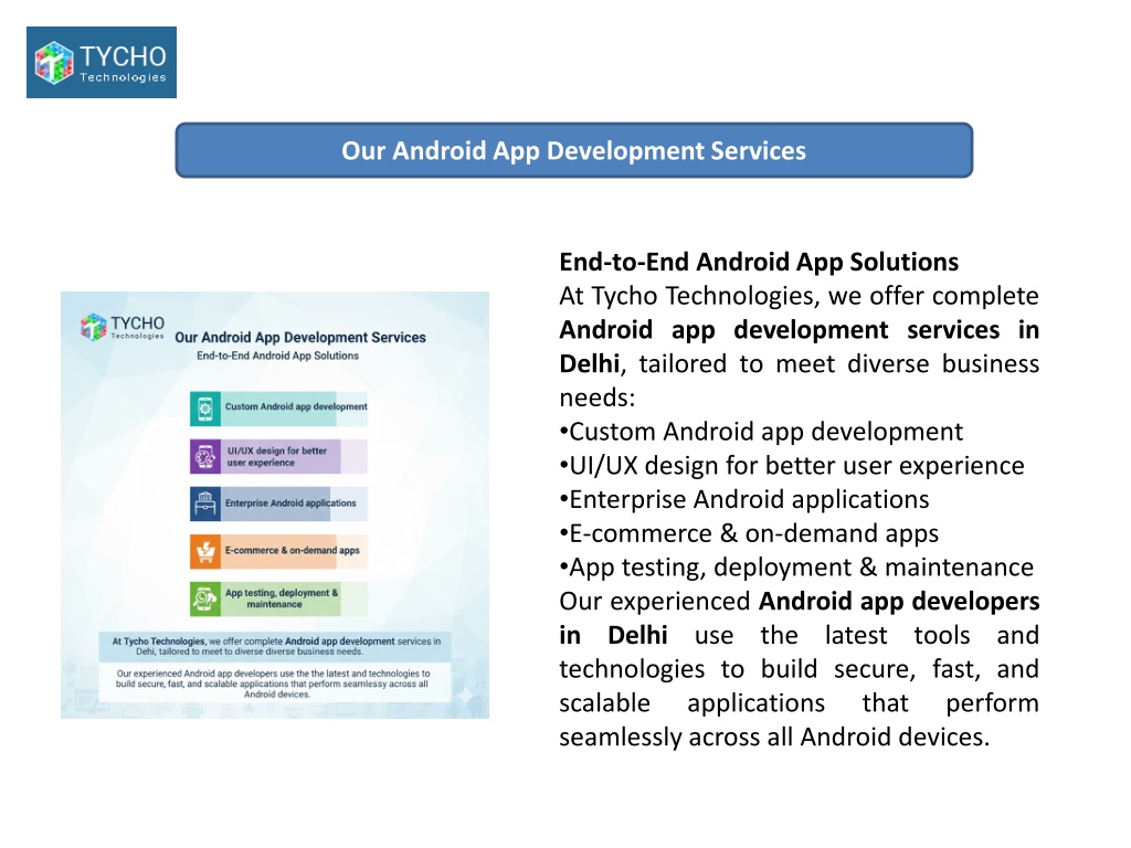1. Introduction to Tycho Technologies Your Trusted Mobile App Development Partner in Delhi Tycho Technologies is a leading mobile app development company in Delhi, delivering innovative, scalable, and user-centric mobile applications for startups, SMEs, and enterprises. We specialize in building high-performance Android applications that help businesses grow, engage users, and stay ahead of the competition. With a strong focus on quality, creativity, and technology, our expert team transforms ideas into powerful mobile solutions. From concept to launch and beyond, Tycho Technologies ensures smooth development, timely delivery, and complete client satisfaction.