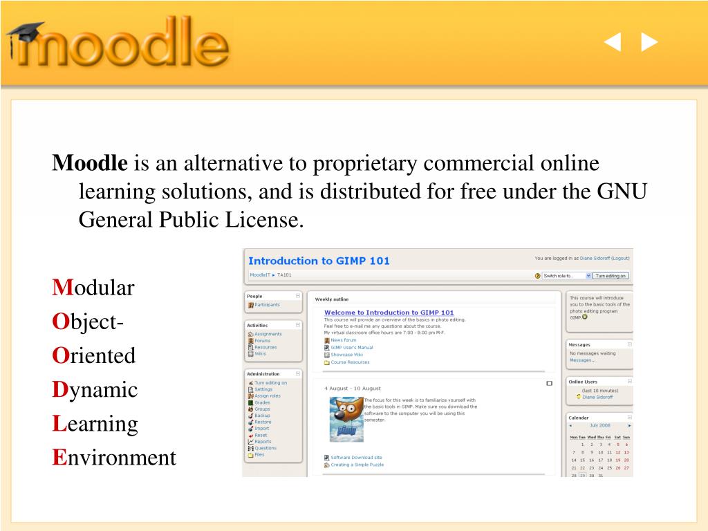 t u Moodle is an alternative to proprietary commercial online learning solutions, and is distributed for free under the GNU General Public License. Modular Object- Oriented Dynamic Learning Environment