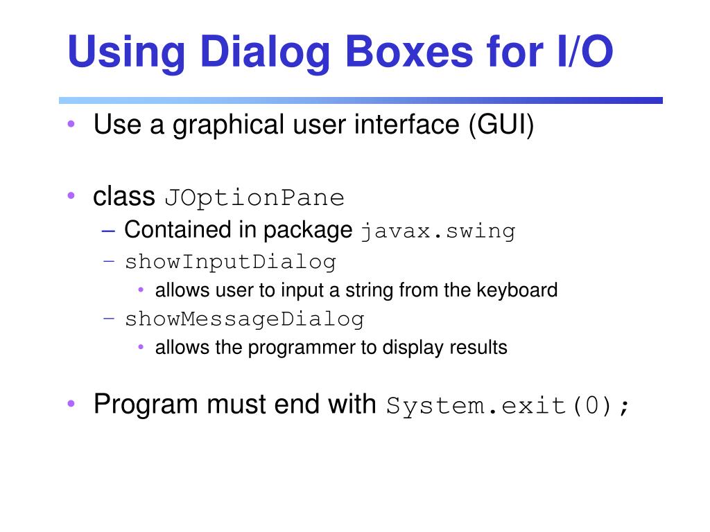 Using Dialog Boxes for I/O • Use a graphical user interface (GUI) • class JOptionPane • Contained in package javax.swing • showInputDialog • allows user to input a string from the keyboard • showMessageDialog • allows the programmer to display results • Program must end with System.exit(0);