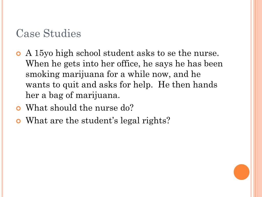 Case Studies A 15yo high school student asks to se the nurse. When he gets into her office, he says he has been smoking marijuana for a while now, and he wants to quit and asks for help. He then hands her a bag of marijuana. What should the nurse do? What are the student’s legal rights?
