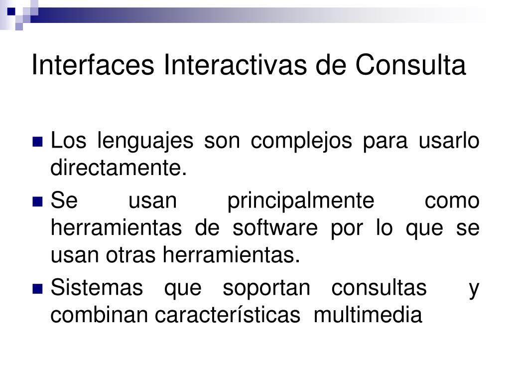 Interfaces Interactivas de Consulta • Los lenguajes son complejos para usarlo directamente. • Se usan principalmente como herramientas de software por lo que se usan otras herramientas. • Sistemas que soportan consultas y combinan características multimedia