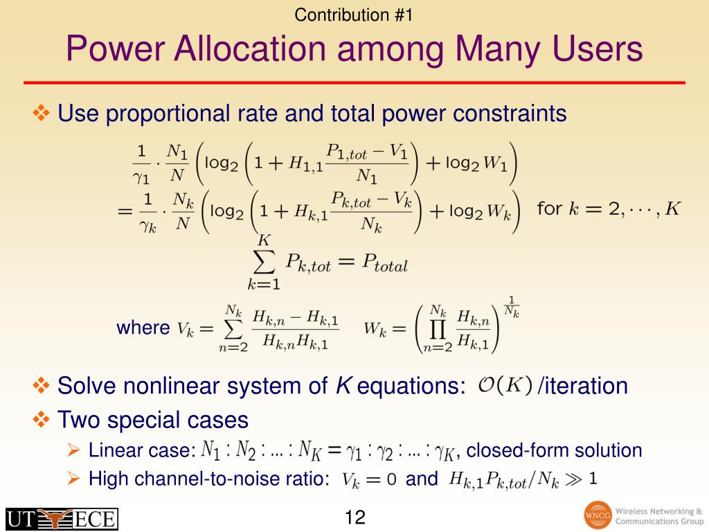 Contribution #1 Power Allocation among Many Users • Use proportional rate and total power constraints • Solve nonlinear system of K equations: /iteration • Two special cases • Linear case: , closed-form solution • High channel-to-noise ratio: and where