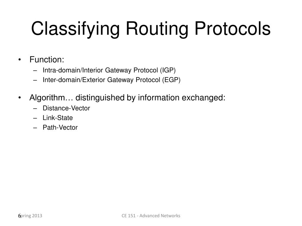 Classifying Routing Protocols • Function: • Intra-domain/Interior Gateway Protocol (IGP) • Inter-domain/Exterior Gateway Protocol (EGP) • Algorithm… distinguished by information exchanged: • Distance-Vector • Link-State • Path-Vector CE 151 - Advanced Networks