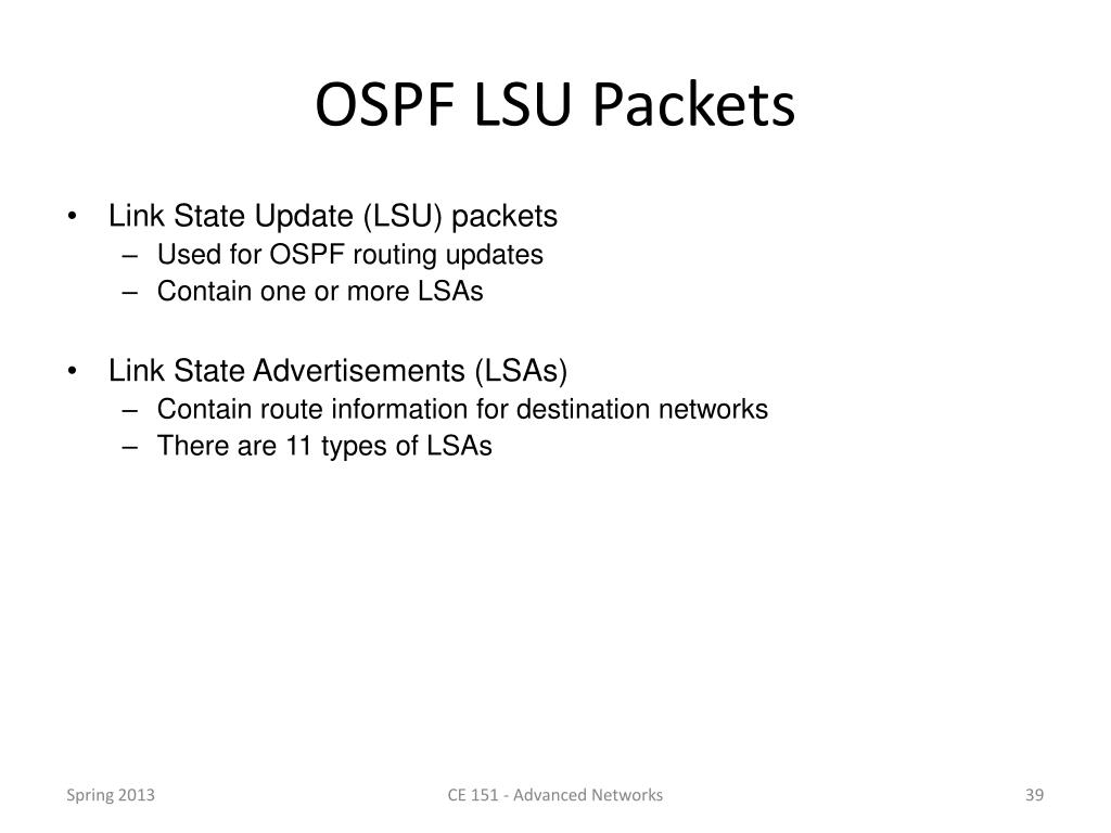 OSPF LSU Packets • Link State Update (LSU) packets • Used for OSPF routing updates • Contain one or more LSAs • Link State Advertisements (LSAs) • Contain route information for destination networks • There are 11 types of LSAs CE 151 - Advanced Networks