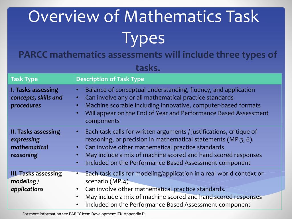 PARCC mathematics assessments will include three types of tasks. Overview of Mathematics Task Types For more information see PARCC Item Development ITN Appendix D.