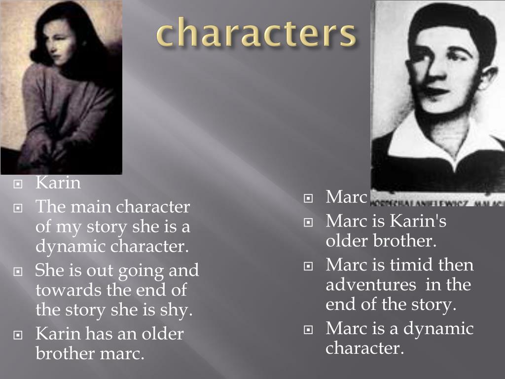 characters • Karin • The main character of my story she is a dynamic character. • She is out going and towards the end of the story she is shy. • Karin has an older brother marc. • Marc • Marc is Karin's older brother. • Marc is timid then adventures in the end of the story. • Marc is a dynamic character.