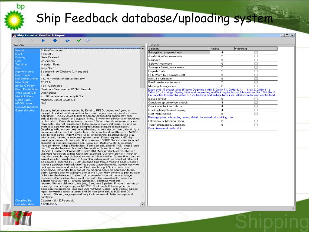The gathering of port and terminal information. This process is not new, but we needed to start using the information more pro-actively. BP-owned and controlled fleets are required to complete feedback forms for every port visit. (also spot chartered vessel on request) Vessel Feed back report Now aligned with Intertanko format. What is Ship Terminal Feedback?